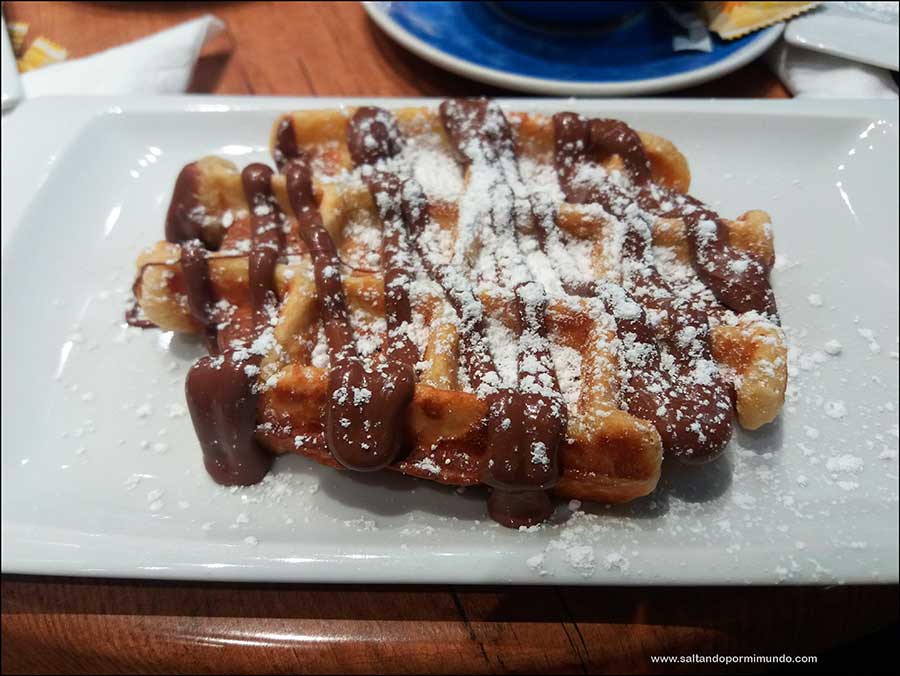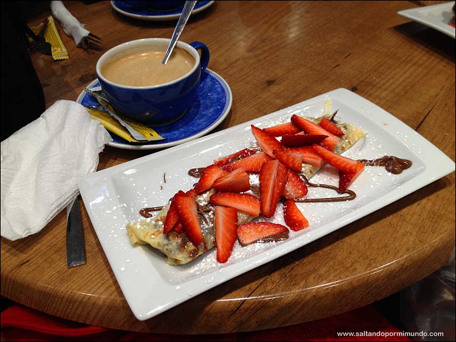 Tras estar unas horas en el bar, salimos a la calle y el Diluvio seguía mostrándonos toda su fuerza, así que nos fuimos a una crepería cercana donde enlazamos la comida con la merienda, para ver si así dejaba un poco de llover.