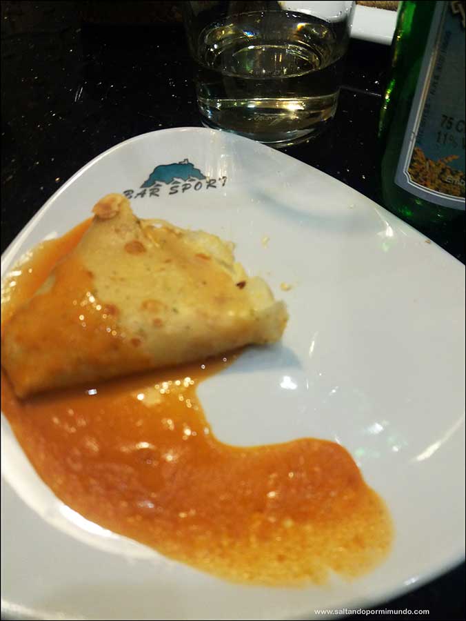 Lo que nos encanta de San Sebastián es ir probando diferentes sitios. Pero en esta ocasión el salir de un bar para entrar en el siguiente en menos de 100 metros suponía sacar los remos y coger la barca para cruzar de un lado al otro. Así que lo intentamos un par de ocasiones y ya decidimos no tentar más a la suerte y nos establecimos en uno cuya barra de pintxos era inmensa. Claro que esto no es difícil porque así son todos los sitios de San Sebastián.