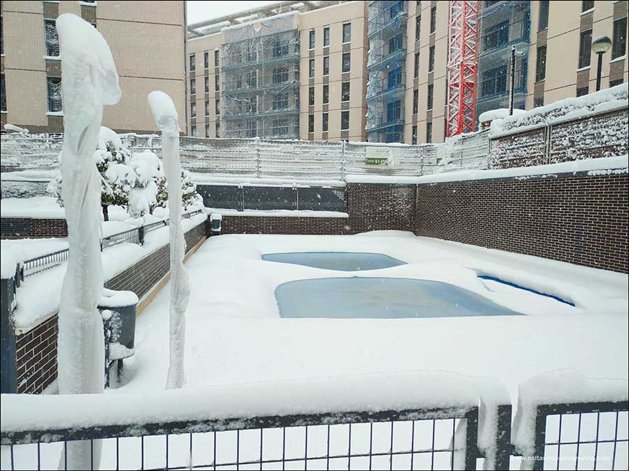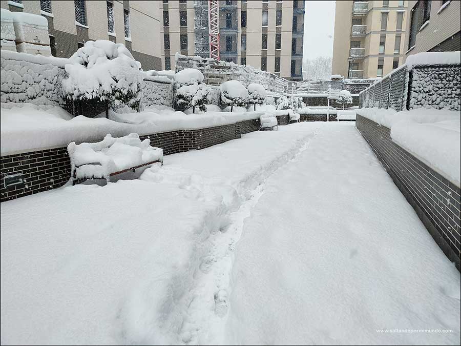 Abajo en la urbanización, nos sorprende la cantidad de nieve que ha caído. Apenas podemos llegar a la piscina y las piernas, al caminar se nos hunden casi hasta las rodillas.