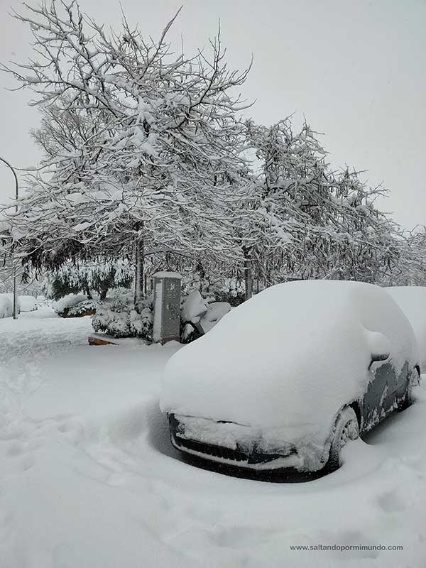 Así que salimos a hacer unas gestiones, antes de las 11 de la mañana, que es la hora en la que va a empezar a nevar. En el ratito que estamos en una tienda, ha empezado a nevar con mucha fuerza. El aparcamiento está completamente blanco y el coche cubierto de nieve.