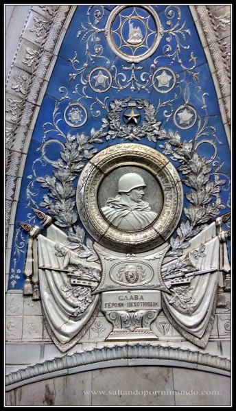 Las bóvedas centrales están divididas por arcos que comprenden grandes bajorrelieves con los medallones de soldados del ejercito soviético.