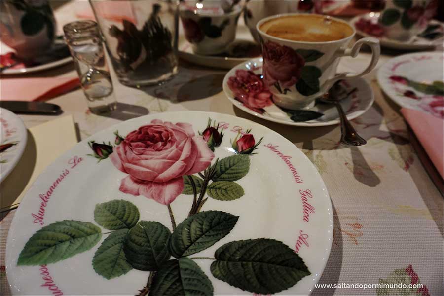 Y también como sabéis, somos unos envidiosos y vemos en otras mesas unas pastas típicas inglesas y decidimos pedirlas únicamente por hacer uso del bonito soporte donde lo traen. La vajilla tampoco se queda atrás y queremos llevárnosla a casa.