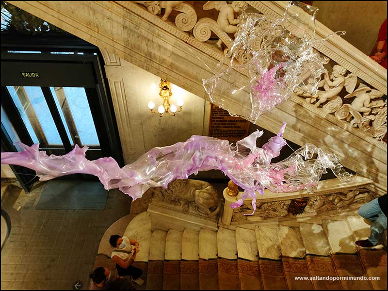 Ya sólo por entrar hasta aquí ha merecido la pena. A medida que subes no sabrás en qué fijarte: en los leones que custodian la subida (y que nos recuerdan mucho aquél que viéramos en Lucerna y también los del Santuario de Covadonga en Asturias), la escultura del Ángel vigilante, los frescos del techo con la representación de España y sus colonias, en los medallones de los artistas.